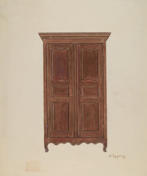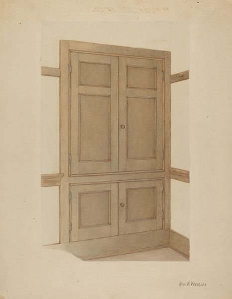 Curator: Let's consider "Doors to Confessional," a drawing rendered in pencil and charcoal on paper by Ethel Dougan in 1937. Editor: My immediate impression is one of somber restraint. The palette is muted, almost monochromatic. It feels architecturally rigid, yet simultaneously decayed and vulnerable. Curator: Indeed. The drawing style evokes realism, focusing our attention on the architectural element, as well as, quite directly, its implicit role in spiritual and societal rites of confession. It reminds me of places like Alcatraz prison that operated at this same time period. There is a heaviness, both material and symbolic. Editor: The composition seems entirely built around symmetry, balanced around a firm vertical axis. This adds to the sense of confinement. Even the windows look as if it wants to contain everything inward to keep you out, making the image, ultimately, very powerful despite the relatively simple forms on the white surface. Curator: Exactly! And consider the choice of subject matter. A confessional isn't simply a door. It’s a threshold, a psychological and spiritual boundary where one navigates guilt, redemption, and the human need for absolution. Think about the significance of closed doors throughout history; of entering them voluntarily, to sit in judgement of ourselves, in an act of forced honesty? Editor: I am most fascinated by the rendering of wood texture and of decay. These choices contrast perfectly with its formal rigid structure; the piece feels at once modern and historic. The marks made on the material's surface invite us to question its origin. I wonder where these were exactly located. Curator: It pushes me to think about our impulse to reveal and conceal and to engage with those actions historically, institutionally. It prompts me to question the purpose of the threshold in the modern day, the power it carries. Editor: For me, I was first drawn into the surface characteristics; then, that led to this exploration of form and texture in conjunction. Fascinating.