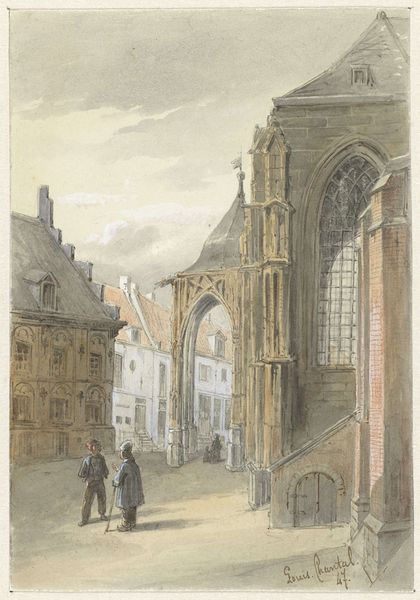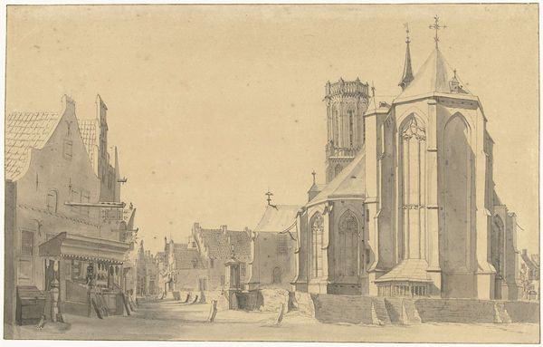 Curator: Adrianus Eversen’s "Gezicht te Amersfoort, rechts een deel van de St. Joriskerk" – or, "View of Amersfoort, with part of the St. Joris Church on the right" – crafted between 1828 and 1897, using pencil, ink, and paper, showcases a muted palette and quiet composition. This drawing gives off a somber, contemplative vibe. I'm curious, how does one interpret the narrative woven within this urban tableau? Editor: Well, I'm struck by how the imposing architecture seems to dwarf the figures in the foreground. It's as if Eversen is emphasizing the enduring presence of institutions – in this case, the church – versus the transient lives of everyday people. Is that a fair reading? Curator: Absolutely, but consider also the rise of civic identity in the Netherlands during this period. Eversen captures a specific locale, embedding the viewer within a burgeoning sense of national pride. Do you think his choice to emphasize genre painting contributes to that? Editor: Definitely. Depicting ordinary people engaged in daily life certainly fosters a connection to a place. It suggests belonging, right? Plus, the architectural accuracy – I mean, look at the detail in the St. Joris Church! – roots the image firmly in reality. It's not just any city; it's Amersfoort. Curator: Precisely. The 'realism' isn't merely representational; it's performative. It declares: this place, these people, matter. What I find especially potent is how Eversen positions the church. Not as some untouchable monument, but integrated directly with quotidian life. Makes you think about the church's social function, doesn’t it? Editor: It does. I hadn't considered that level of social commentary before. Thanks, I now have a new appreciation for this drawing! Curator: And I appreciate your insight into the psychological impact of the architectural scale.