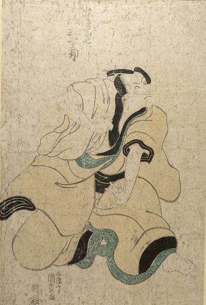 Curator: This is a print by Kitagawa Utamaro II, known as "Woman Playing Hand-Drum (Tsuzumi) for Two Dancing Children," currently held at the Harvard Art Museums. The dimensions are roughly 39 by 27 centimeters. Editor: It has a delicate, almost fleeting quality. The figures seem to float on this warm ground, brought to life by their patterned clothes. Curator: Utamaro’s Ukiyo-e prints often captured scenes of everyday life, elevating them to a beautiful transience. Here, a woman provides the music, while the children dance. Consider the drum and the labor required to produce these prints. Editor: And the cultural weight of performance. The drum, the robes, the dance itself—it's all a display of cultural memory. Curator: Indeed. Woodblock prints were crucial for disseminating cultural practices in Japan and it allowed popular culture and the world of the elite to mingle. Editor: I like that it points to how our cultural habits become woven into our very being. I’ll be thinking about it.