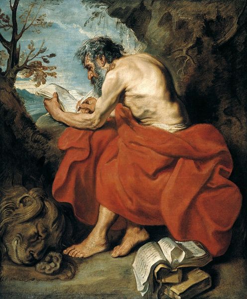 Editor: So, here we have Jan van Hemessen's "St. Jerome," an oil painting from 1543. He’s depicted almost nude in a rocky landscape. The overall impression is... intense. What do you see in this piece? Curator: Beyond the immediate religious subject matter, I see a potent exploration of masculinity and power, or perhaps its renunciation. Look at the hyper-muscularity of Jerome’s body juxtaposed with his act of self-flagellation, holding the stone. It presents a tension between physical dominance and spiritual submission. Do you think this image challenges or reinforces established hierarchies? Editor: I hadn't considered the masculine aspect so directly. The overt display of physical form made me initially think about idealization of the body through the lens of classicism, but he looks rather forlorn. Is van Hemessen perhaps offering a subtle critique of those power structures by displaying the discomfort involved? Curator: Exactly. Think about the socio-political context of the Northern Renaissance. The rise of individual piety, fueled by humanist ideals, allowed for nuanced, even critical, engagements with traditional iconography. Hemessen, rather than simply illustrating a saint, seems to dissect the performative aspects of religious devotion, possibly exposing the inner turmoil of conforming to such rigorous ideals. Note the skull in contrast to his body. Editor: It makes me think of mortality in direct opposition to a kind of ‘living virility,’ to make a strange association. Seeing it as performative is helpful. I wouldn’t have arrived at that reading without your guidance. Curator: And seeing it with your background helps bring light to different aspects of the humanism prevalent at this period. The dialogue between our perspectives reveals the layers embedded within it. Editor: Definitely. It makes me appreciate how much the cultural backdrop shapes not only the art but how we understand it.
