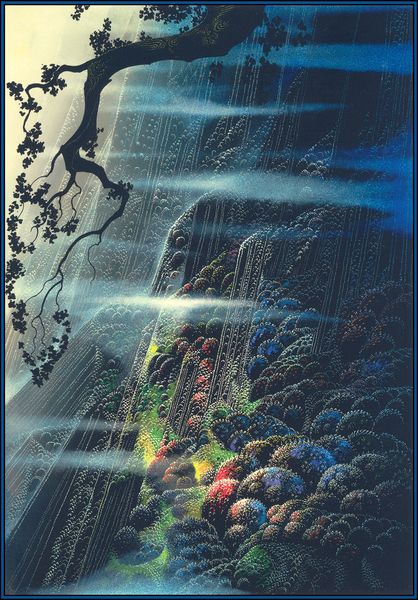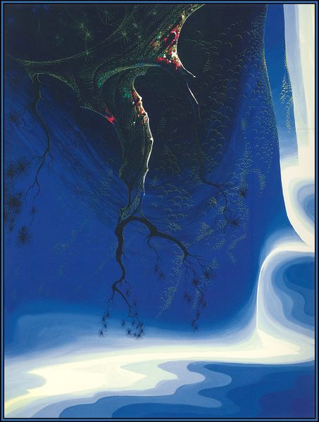 Editor: This is “Jeweled Cliffs” by Eyvind Earle. Gosh, what a fantastic explosion of meticulous detail, an impossible forest clinging to the side of these enormous cliffs. It’s both beautiful and intimidating. What do you see in this piece? Curator: It’s like tumbling into a dream, isn't it? Earle really asks us to consider the sublime, this terrifying beauty in nature that both attracts and overwhelms. You mentioned the detail, which I completely agree with. It is so captivating. It’s not just *what* is depicted, but *how*. The colours are striking; like hidden jewels scattered across a mountainside that isn't quite a mountainside but also feels undeniably, archetypically like the essence of one. Editor: Yeah, that balance feels important. It’s clearly not trying to be realistic, yet there's a certain grounded quality, too. The light feels almost otherworldly. Curator: Indeed! Think of light, filtered through ancient forests, the way mist hugs a craggy peak… there's a romantic, almost mythical feeling, isn't there? Do you get the sense of infinite scale, looking at those impossibly tiny trees? Editor: Absolutely, especially juxtaposed against the massive cliffs. So the painting is about feeling, then? Curator: Well, for me, yes. It’s an emotional landscape. He invites us to *feel* the weight of the world, the beauty, and maybe a little bit of our own insignificance within it. A powerful recipe! Editor: It is. I appreciate how you drew out the connection to the feeling of nature and the idea of the sublime. Curator: My pleasure. Art, after all, is about connecting the tangible to something more profound, right? This feels like a great example.
