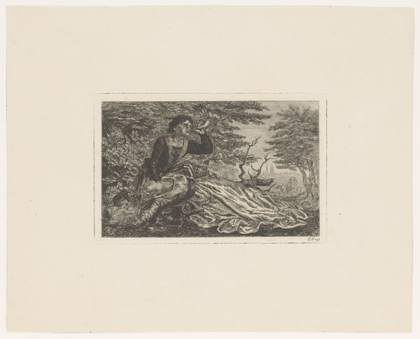 Max Klinger created 'Siesta I', an etching from his series 'Radierte Skizzen'. Klinger was a German Symbolist painter, sculptor, and printmaker whose work often explored the themes of eroticism, death, and social critique. This image shows three figures in a state of repose, their forms blending into the landscape, almost indistinguishable from the rocks and drapery surrounding them. This blending of bodies with the landscape is heavy with the feeling of the period’s psychological explorations. Klinger’s era was marked by burgeoning awareness of the power of the unconscious mind, influencing artists to explore dreamlike states and the blurring of boundaries between reality and fantasy. Klinger, who was influenced by philosophers such as Schopenhauer, was interested in the representation of man's dreams and the world of the subconscious. Here he seems to suggest a world where consciousness is suspended, and bodies merge with their environment. Is this an embrace of the peace in non-being or a terrifying loss of self?