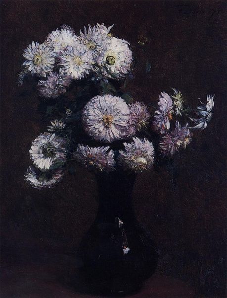 Curator: Jean Benner's "Fleur," completed around 1860, offers a striking study in contrasts. Editor: My immediate impression is of a dream—billowing white forms emerging from profound darkness. The composition feels almost theatrical. Curator: Indeed. Benner, working during the Romantic era, uses the oil paint medium to amplify the inherent tension in the imagery, pulling realism towards an idealized state. Editor: The flowers, likely hydrangeas, hover in a void. Their dense clusters of petals are beautifully rendered, creating complex tonal relationships that draw the eye in. It's about line and tone and density here, wouldn't you agree? Curator: Certainly. But I also find myself thinking about the symbolism of white flowers. Historically, they've represented purity, innocence, and even mourning, lending the painting a depth beyond pure aesthetics. Think of how the French associated white with royalty, how those qualities reflect societal norms of the time. Editor: I appreciate the reference, though focusing strictly on floral symbolism threatens to turn these luminous shapes into mere allegories! Doesn't the dark ground serve a critical compositional role, intensifying the whites and establishing the illusion of depth and space? It prevents the picture from collapsing into a flat, decorative arrangement. Curator: Precisely, Benner expertly wields this interplay. It creates a fascinating dialogue about cultural values, perhaps questioning those ideals by placing them in such an ethereal and uncertain setting. Editor: Yes, a painting isn't only a visual artifact—it holds implicit and explicit values. Benner is prompting us to interpret it through an interplay of form and icon, in context with the surrounding world. It invites viewers to a certain reading, though the aesthetic is always key to its effect. Curator: Ultimately, “Fleur” resonates for me as a visual manifestation of cultural memory, highlighting beauty but also alluding to the transience and fragility inherent in ideals. Editor: Agreed. It’s that tension, the play between the ethereal form and its dark grounding, which allows Benner’s creation to remain relevant, allowing us to encounter a fresh image each viewing.