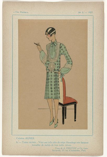 This fashion plate, titled "Très Parisien, 1923, No. 4," was likely printed using a combination of line block and pochoir, a stencil-based technique. The anonymous artist used these processes to depict a stylish dress made of white silk lace, embroidered with colorful florets. The dress's design demonstrates a real tension between handmade and mass-produced aesthetics. The lace and embroidery are skilled, time-intensive processes, yet presented here as part of an industrial fashion system. Notice how the dress's loose fit at the waist reflects the changing styles of the era, facilitated by new textile technologies that allowed for more fluid and comfortable garments. The green velvet and silver details would have been produced independently, then integrated by a dressmaker. The print itself, with its crisp lines and bright colors achieved through the pochoir process, speaks to the rise of visual culture and consumerism. Fashion plates like these fueled desires and aspirations, making luxury accessible to a wider audience, at least in image form. This artwork captures a pivotal moment when handmade elegance met the efficiency of modern production.