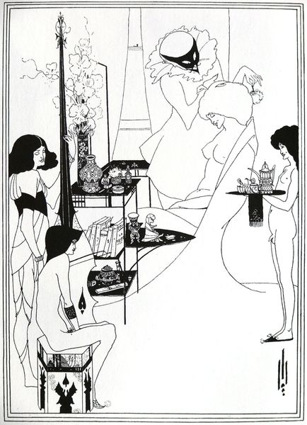 Editor: We're looking at Rafael Zabaleta's ink drawing, "Female nude from back with stove." The high contrast and somewhat domestic setting make it feel very intimate, almost like we're intruding on a private moment. What do you see in this piece that maybe I'm missing? Curator: Notice the starkness of the black ink against the paper, creating clear, almost geometric shapes. How does Zabaleta employ line weight and contour to define form and space? The stove, rendered with careful detail, sits in contrast to the flowing lines that describe the figure, drawing the eye towards the planes and intersections. Do you perceive the various visual elements contributing to a sense of harmony or tension? Editor: I do see the tension, now that you mention it. The stove seems very rigid compared to the fluidity of the figure, almost imposing. Is that contrast intentional, do you think? Curator: Undoubtedly. Consider the artist's calculated placement of these disparate objects. The stove, a symbol of domesticity and perhaps even warmth, alongside the exposed female figure. Observe how Zabaleta leads our gaze across the surface with varying densities of line, almost a controlled choreography. Is it a harmonious coexistence or a dialogue of opposing forms? Editor: I hadn't thought about the choreography of the lines. Seeing how the different line weights direct my eyes makes the whole composition make much more sense. Thank you! Curator: Indeed. Appreciating art is learning to decipher the vocabulary of form, line, and the deliberate arrangement that shapes our visual journey.