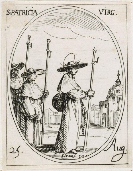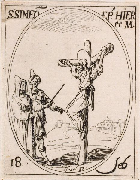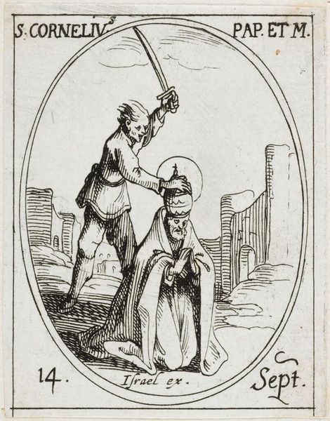 Editor: This engraving, "Saint Flavianus" by Jacques Callot, depicts a rather gruesome scene. The composition is striking, but what symbols can we unpack here? Curator: Notice how Flavianus's martyrdom is depicted with brutal directness, an awl piercing his eye. This act, laden with horror, also signifies the unwavering faith that defied earthly powers. Editor: So, the violence serves as a symbol for strength of belief? Curator: Precisely. Consider the placement of the torturer, his stance radiating a determined cruelty. What does his presence evoke? Editor: A stark reminder that religious conviction often comes at a high price. Curator: Indeed. It’s a potent reminder of cultural memory, and the cost of spiritual devotion, wouldn't you agree? Editor: Absolutely. Thank you; I'll definitely look at similar works with fresh eyes now.