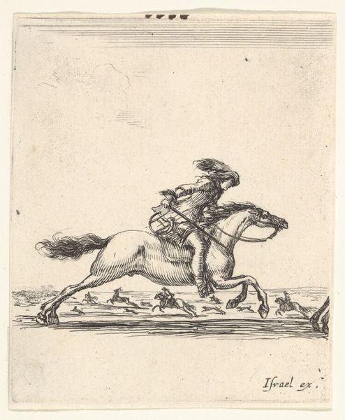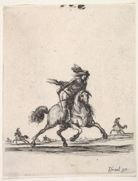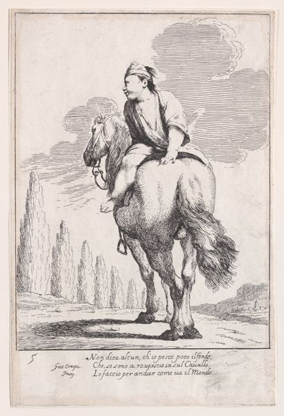 Giuseppe Maria Crespi created this etching, Plate 18: Cacasenno on horseback, as part of a series inspired by the humorous stories of "Bertoldo, Bertoldino, and Cacasenno." Crespi worked in Bologna during the late Baroque period, a time when artists were increasingly exploring genre scenes and everyday life. This print depicts Cacasenno, one of the central characters, precariously perched on a horse. His awkwardness and the horse's strained posture create a sense of comical imbalance. The inscription below the image reinforces the scene's humor, and is a commentary on the dangers of lacking moderation. Crespi's work often incorporated social commentary, using humor to critique the follies and foibles of society. In this print, the artist uses laughter to temper any overt moralizing. How might the caricature of Cacasenno on horseback serve as a mirror reflecting our own vulnerabilities and missteps?