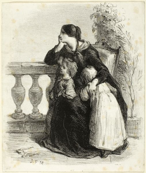 Curator: Alexandre Antigna’s 1857 engraving, "Distrust," presents a stark narrative scene, realized in ink on paper. Editor: Oh, wow, just from a glance, it feels heavy, burdened. The old woman's face tells a story of hardship etched in every line, and the young girl, clutching her violin… there's a whole silent drama unfolding. It feels Dickensian, almost gothic. Curator: Indeed. The technical skill is evident, the lines are precise and create great depth. But what fascinates me is how the printmaking process itself allowed for a wider circulation of such social commentary. The image speaks of poverty, perhaps, and the commodification of labor. Editor: You're right; it's like this was meant to be multiplied, seen widely, spark a conversation about… well, about trust, or the lack thereof. But on a more visceral level, the contrast gets to me; this sharp, unforgiving light illuminating this grim tableau of generational anxiety. Is that too strong? Curator: Not at all. Look closely at their garments. Notice the textures meticulously rendered through cross-hatching? Consider the labour involved in producing these images, and how prints became a key medium to express ideas. It is this emphasis on production and access that intrigues me. Editor: Mmm, access… it makes you think. I mean, an engraving allowed for multiple copies, reaching audiences beyond the elite. But what did they really see when they looked at this image? Did they consider the lives represented, the violin player forced to play, probably out of dire need? The "Distrust" is like an open window into a forgotten attic filled with unspoken histories. Curator: A potent summary. It is easy to feel it as a modern viewer. And while artistic vision offers interpretations and critique of human struggle and empathy. That vision had to be etched onto a plate. From there the presses run and copies are distributed widely offering insights into a difficult truth. Editor: Yes! Like plucking the notes of truth out of the darkness one etching at a time… I wonder, could a single image truly change how society hears those melodies? Or only offer an insight to their importance for survival. Curator: Whether it inspires change or simply awareness, the impact of such readily reproducible imagery is undeniable. This piece, in particular, opens dialogue concerning socio-economics, then and even now. Editor: Absolutely. Thanks for highlighting the depth behind this engraving—I feel like I am taking so much more away from this simple-seeming black and white piece now!