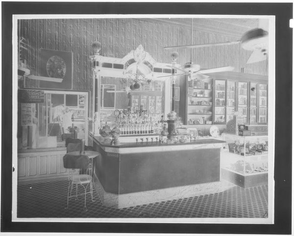 Curator: This is an untitled photograph by Hamblin Studio, depicting the interior of Handell and Brinkley Electric Co. The image, at just over 10 by 12 centimeters, presents a surprisingly detailed scene. Editor: It feels like stepping back in time. The clustering of vintage signs and electrical appliances creates an aura of early 20th-century commercial optimism. Curator: Notice how the composition guides the eye? The checkered floor leads to the back, where a figure stands almost as a focal point, yet the hanging lightbulbs draw the eye upwards. Editor: The lightbulbs are such potent symbols of progress, aren't they? This space is saturated with the promise of modernity and the transformative power of electricity. Curator: Indeed, but even within this apparent positivity, we see the rigid geometry of the signs and the ordered arrangement, suggesting a controlled, almost sterile environment. Editor: Perhaps it reflects a transition from simple craftsmanship to mass production. These objects are not just practical tools; they're artifacts imbued with cultural aspiration. Curator: A fascinating interplay of form and symbol. Editor: Yes, it tells a story without words, really.