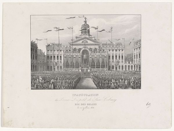 Curator: Here we have Paulus Lauters' "Inauguration of King Leopold I in Brussels, 1831," a print from the same year as the depicted event, currently held in the Rijksmuseum collection. Editor: Wow, it's almost aggressively…orderly? I mean, all those tiny, lined-up soldiers! Gives me this vibe of starched collars and civic pride on steroids. Is it supposed to feel this controlled, or am I just projecting? Curator: Lauters' choice of the print medium allows for a remarkable level of detail, reinforcing a sense of precision and control—key aspects of Neoclassical and Romantic art movements prominent during this period. The composition’s symmetry, along with its linear precision, reflects Neoclassical ideals, but the grand scale and emotional tone resonate with Romanticism. Editor: So, like, order with a side of "feelings"? I dig that. It’s like they're trying to build a new nation out of spreadsheets and sonnets. I'm getting a distinct feeling that this wasn't your average kegger. Curator: Indeed. Consider the symbolism inherent in the cityscape itself. The architectural backdrop provides a structured framework for the event, reinforcing themes of governance and stability. Editor: And Leopold sitting way up there on his throne gives him a kind of removed feel, doesn't it? Like he's watching his kingdom unfurl beneath him. It's cool, in an almost intimidating way. What is your opinion of it all? Curator: This print succeeds as both historical record and political statement. The attention to detail—seen in the precise lines of the architecture and the multitude of figures—renders an almost documentary feel to the engraving. Yet, it also monumentalizes the event. Editor: Makes you think about what gets recorded, what's considered "official." I bet the guy selling sausages outside didn't make it into the national narrative! Overall though, there’s this weird tension in this artwork, where it feels both triumphant and strangely…uptight. I still kind of like it, even if it gives me the jitters. Curator: I find its formal elements and symbolic content fascinating and a strong reminder of the period’s sociopolitical aims, captured in a moment through the lenses of art, isn't it?