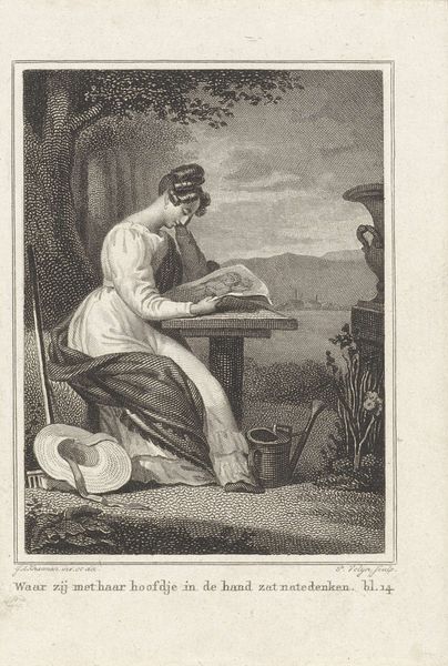 Louis Fabritius Dubourg created this drawing, "De Mildheid," with pen in gray on paper. The composition here is one of gentle curves and quiet contemplation. The subject, a young woman, is rendered in soft lines with a delicate, almost melancholic air. Her form is central, framed by the natural backdrop of trees and foliage, which creates a serene, pastoral setting. The shading is subtle, giving volume without harshness. The light seems to caress the figure, highlighting her downcast gaze and the gentle curve of her arms as she counts coins into a container. Dubourg uses the pen to create a sense of volume and texture through varying densities of line work. This approach elevates the modest act of counting coins to a moment of graceful simplicity, resonating with themes of human virtue. The drawing speaks to a broader cultural fascination with simplicity and the inherent worth found in everyday life. The artwork does not offer a fixed narrative but invites ongoing interpretation.