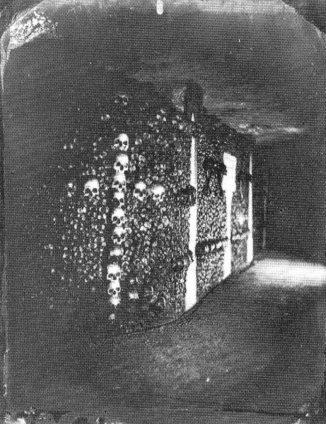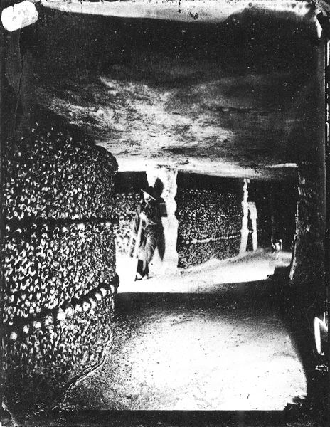 Editor: This photograph, "Catacombes De Paris," was captured by Felix Nadar around 1861 using the gelatin silver process. There's a rather stark, unsettling beauty in the composition of stacked skulls and bones, which create almost architectural forms. How do you interpret this work? Curator: The image presents a compelling study in form and tonality. Note the almost geometric arrangement of the ossuary; the strong verticals and horizontals create a structured space, yet it's a space filled with organic remains. The stark contrast in lighting draws the eye through the photograph, highlighting the textural variations and repetitive patterns. Editor: I notice how the bright doorway draws my eye, like a stark contrast between the darkness inside the Catacombs versus hope of what exists outside. Curator: Indeed. Semiotically, that opening operates as a rupture, a break in the dense pattern of the bones. However, it's rendered almost featureless by the exposure, becoming an abstract shape in itself. Consider how that plays against the texture, depth, and material density within the immediate space in the foreground. Are we meant to interpret an escape, or the artist suggesting an alternative structural approach? Editor: That's interesting! I was thinking of it narratively, but looking at the balance between that white space and the darker areas really changes the composition. Curator: Precisely. It highlights the photograph as an object, distinct from its representational content. Nadar gives the viewer forms and patterns, not simply information. I appreciate that interplay in his photography; it challenges me to appreciate art differently. Editor: Thanks! I'll definitely remember to consider those contrasts as key features from now on.