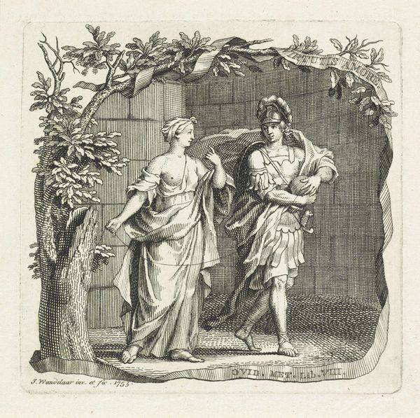 Editor: Here we have Jan Wandelaar’s "Vignet met Theseus en Ariadne" from 1749, an engraving using ink. I am struck by the tension between Ariadne's assertive gesture and Theseus’s burdened stance. What's your take on this piece? Curator: This work invites us to consider the dynamics of power and gender roles embedded in classical narratives, particularly during the 18th century. How do we interpret Ariadne’s agency in a patriarchal world, where her assistance is crucial for Theseus, yet her voice is often silenced or rewritten? Editor: So, it's not just a depiction of a myth, but a commentary on societal roles? Curator: Precisely. The narrative, while seemingly straightforward, acts as a mirror reflecting the social structures and the perceived place of women. We can ask ourselves, how does Wandelaar use visual cues to hint at Ariadne’s potential dissatisfaction or the inherent imbalance in their relationship? Consider the text framing the image – does it reinforce or challenge these interpretations? Editor: I see your point. It’s like the artist is using a well-known story to subtly question the status quo. Curator: Exactly. And what does it mean that Theseus is armored and striding into the world while Ariadne remains stationary, pointing the way? This can be viewed through the lens of feminist theory as well as critical race theory to assess the narrative with the racial hierarchy implicit within Greek myths. The image subtly perpetuates and also questions dominant power structures of that era and perhaps still resonates today. Editor: That’s a powerful perspective. I never thought of it that way. Curator: Examining these classical works with contemporary tools is crucial for understanding not only art history, but also how those narratives continue to shape our understanding of identity and power dynamics. Editor: Thanks, I’ll definitely look at art differently now. Curator: As will I! These dialogues provide valuable insights and offer space for crucial discussions on culture and society.