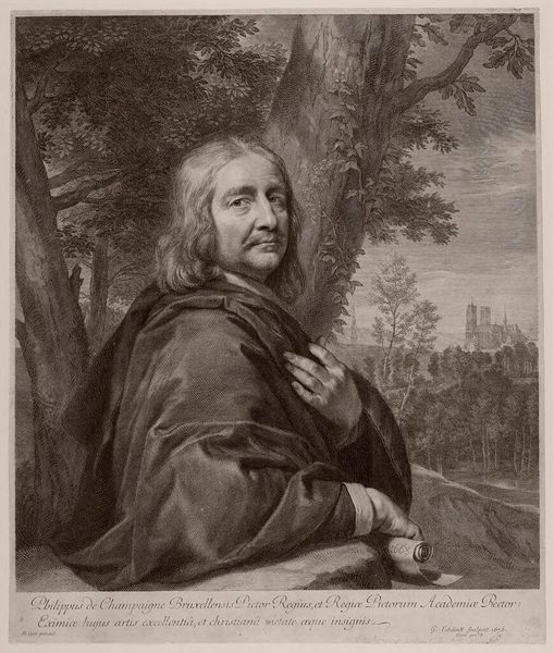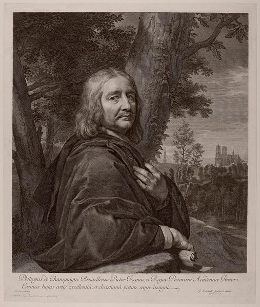 Curator: Looking at this print, there’s an immediate sense of gravitas, a thoughtful almost melancholic mood. Editor: Indeed. Here we have a 1676 engraving by Gérard Edelinck, a portrait of Philippe de Champaigne. It’s quite remarkable, both for its artistic quality and its place within a network of power. Curator: Philippe de Champaigne, a prominent painter himself... What is emphasized through the visual language here? The gaze directed toward us carries something both assertive and contemplative. It speaks of positionality. Editor: You pick up on that tension beautifully. The imagery surrounding him – the landscape, a hint of architectural grandeur in the distance, all suggest a learned understanding of enduring motifs, and speaks to status. This recalls traditions of portraits as affirmations of power and social order during the Baroque era. Curator: I think it’s more than simply the iconography of class; the symbolic rendering gestures to his deeply invested intellectual life as a major European artist and professor at the Académie Royale de Peinture et de Sculpture. His gaze reads as almost defiant to a kind of tradition and expectation. I read that in a powerful way, knowing he stood at the nexus of royal and artistic politics in France during this period. Editor: What resonates most deeply for me, in this close likeness, is that de Champaigne's physical placement next to a tree indicates his rootedness, a connection to history and established lineage. And that rolled parchment… perhaps an emblem of intellectual achievement, or his creative output itself. But I wonder if his somewhat loosened robe tells us he seeks liberation from established conventions. It creates an undeniable intimate feeling. Curator: Exactly. I see an individual asserting their complexity against established authority; de Champaigne existed within very powerful networks, yet held to his individuality through all the ideological tensions in the 17th Century. It's precisely that complexity which fascinates me. Editor: It reminds us that symbols always work on multiple registers; tradition is never accepted without moments of reinvention. It is certainly in view, a great achievement on the artist’s part.