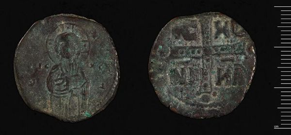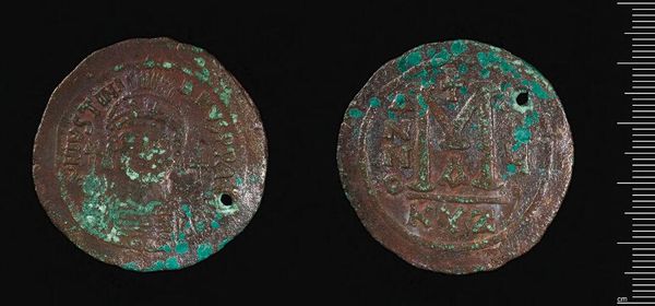 Editor: Here we have a Follis of Maxentius, from Ticinum. It has a certain weight, doesn't it? Considering its age and wear, what strikes you most about its composition? Curator: The pronounced circular form, coupled with the incised figural representation, creates a compelling tension. Note the degree to which the artist uses the limitations of the coin's surface to define the imperial narrative. Editor: That's interesting. I hadn't considered how the shape itself dictates the story. Curator: Precisely. Consider, too, the way the artist uses line to create depth within such a restricted space. The wear only accentuates this tension, wouldn't you agree? Editor: I see what you mean, it’s all about working with the limitations and making something powerful. I’ll never look at coins the same way!