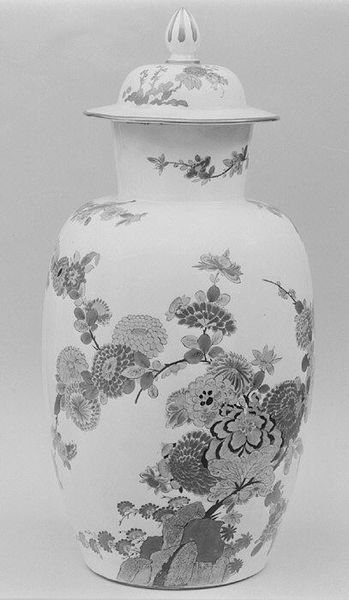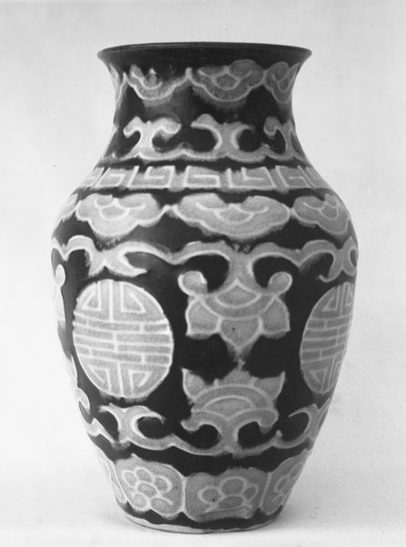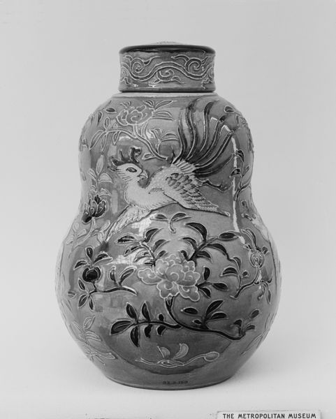 Editor: We’re looking at a ceramic vase, created around 1760 by Rakutozan. It's currently housed in the Metropolitan Museum of Art. I'm struck by the intricacy of the design, especially given the medium. How does this piece speak to you? Curator: It's fascinating to consider this vase through a materialist lens. Think about the labor involved in its creation. Not just the artistic skill of Rakutozan, but also the mining of the clay, the preparation of the glazes, the firing of the kiln. These are all processes, deeply rooted in social and economic structures of the time. Editor: So you're suggesting the vase embodies more than just aesthetic beauty; it also reflects the socio-economic context of its production? Curator: Exactly. Consider the materials themselves. Where did the clay originate? Were specific minerals added to achieve that glossy, dark finish? What was the energy source used to fire the kiln and what does that indicate about the artist's location and connections? The answers reveal details about 18th-century industry and trade networks, the consumption of luxury goods and possibly global exchange too. Editor: It challenges the idea of art existing in a vacuum. It’s like each component has its own story interwoven into the whole piece. Curator: Precisely. And it also raises questions about the traditional hierarchy separating "high art" from "craft." Was this vase purely decorative, or did it have a functional purpose? Who was the intended consumer, and what did its ownership signify in that period? Thinking about the production, consumption, and social value embedded within this object disrupts traditional art historical narratives, don't you think? Editor: Definitely. I never thought about a vase holding so much historical information. I will view the object differently now! Curator: Absolutely! That awareness will only sharpen your vision going forward.