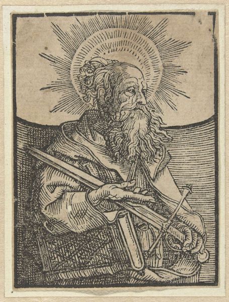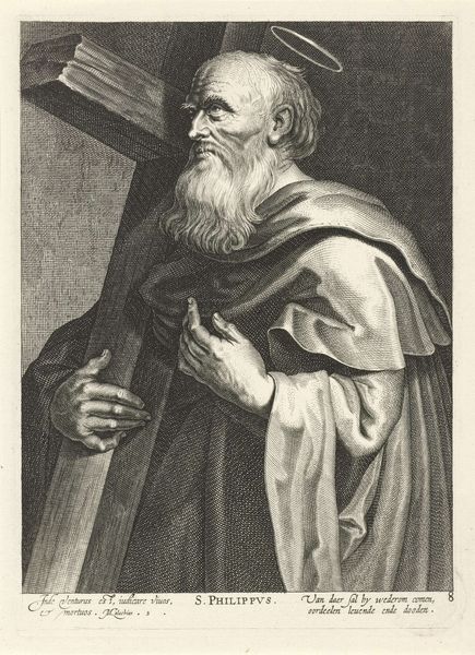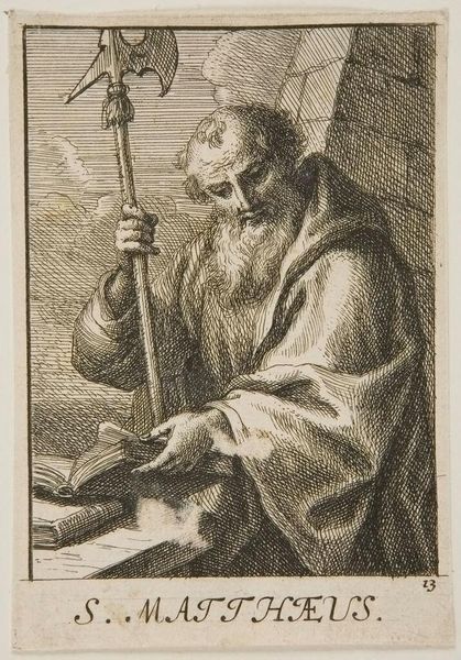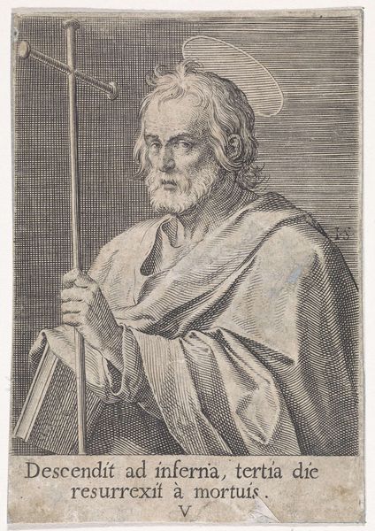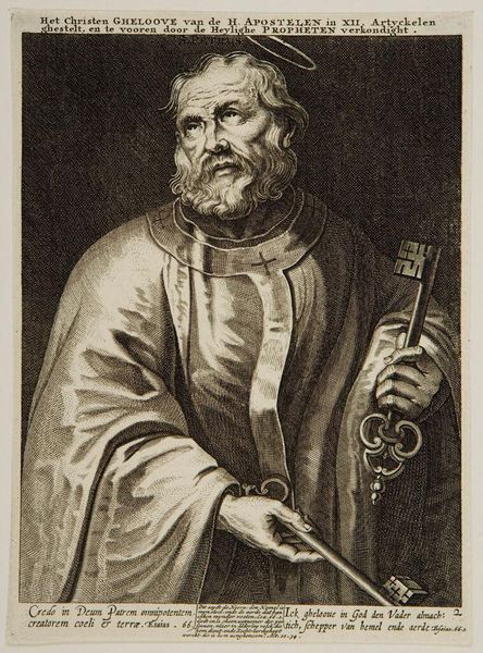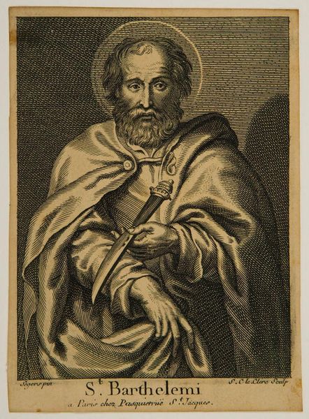 Editor: Here we have Sébastien Le Clerc the elder's "Saint Peter," an engraving. The texture created by the lines is really striking, almost giving the figure a palpable presence. What do you notice about this print? Curator: I’m drawn to the way Le Clerc uses the print medium to disseminate imagery. Consider how prints made religious figures like Saint Peter accessible, shaping public devotion and even political allegiances in a time before mass media. Editor: That's fascinating! I hadn't considered the political impact of religious art beyond just the church. Curator: How do you think images like this one affected social structures? Editor: I guess it gave people direct access to figures of authority, making them feel more connected and perhaps influencing their beliefs. Curator: Exactly, and think about the power that gives to both the artist and the institutions that commission and distribute these images. A lot to consider!