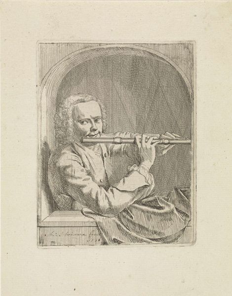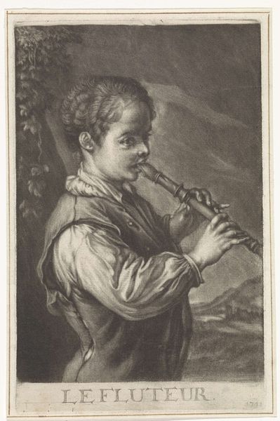 Nicolaes Six created this print of a young man playing the flute around the late 17th or early 18th century. Music, particularly the flute, often symbolizes harmony and pastoral ideals, evoking a sense of tranquility and simpler times. Consider how the image of a flute player has echoed through history, from ancient depictions of Pan in Greek mythology to Renaissance paintings of musical gatherings. The flute, with its simple yet evocative sound, appears in various contexts, each subtly shifting its symbolic weight. The act of playing music, especially the flute, also touches deep emotional chords. It transcends mere auditory pleasure, engaging our subconscious with its rhythmic patterns. This image, like others of its kind, taps into a collective memory of music as a source of solace and emotional expression. The boy's focused expression conveys a sense of inner peace and concentration, which is further amplified by the harmonizing sounds he creates.