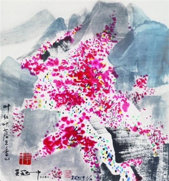 Wu Guanzhong made this painting with ink and colour on paper, and right away you can see how he’s not trying to hide the process. There's such a sense of immediacy, a kind of energetic searching that I really respond to. Look how the thick, juicy blacks of the lotus leaves contrast with the airy lightness of the dragonfly hovering above. The stark verticals create a rhythmic pulse, punctuated by the seed pod and those scattered flecks of green that pop like little surprises. It’s a deceptively simple composition, but notice how the seemingly casual strokes build up to create a really dynamic tension between the solid forms and the open space. It puts me in mind of Franz Kline, but with this whole other sensibility that comes out of Chinese landscape painting traditions.