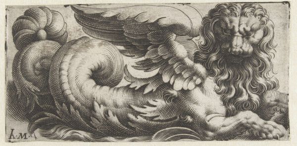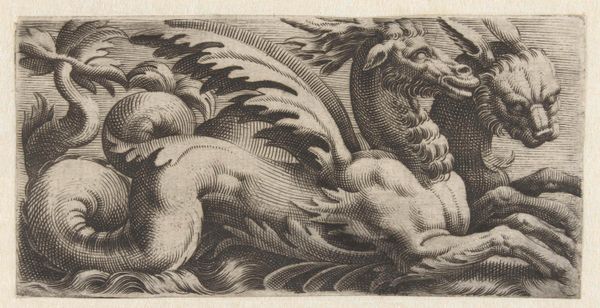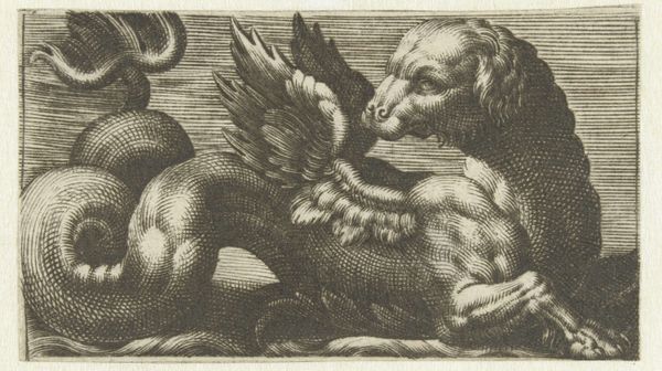 This “Gevleugelde zeestier met een sik” or winged sea bull with a goatee, was made by Giovanni Andrea Maglioli, using etching. The image is achieved by covering a metal plate with wax, then using a sharp needle to draw into the wax, exposing the metal. The plate is then submerged in acid, which bites into the exposed lines. This painstaking process is repeated to achieve the desired depth and tone. Maglioli would have produced many impressions from the single plate, each one involving labor. The winged bull is a fantastic creature, emerging from decorative swirls, and the waves below, all rendered in meticulously etched lines. The textures of the bull's hide, wings, and goatee are strikingly detailed. Prints like this one circulated widely, and were collected in albums, alongside drawings. They offered easily accessible experiences of art, spreading images and ideas broadly. The amount of work involved in this process shows the engraver's commitment to their craft. The beauty and complexity of the image challenge traditional notions of art, inviting us to consider the labor and skill involved in its creation.