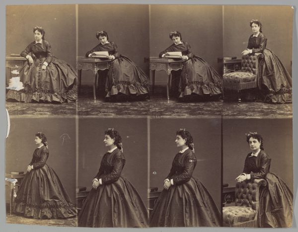 Editor: Here we have "du Beaumenil, Forsyth", a gelatin-silver print from around 1862 or 1863 by André-Adolphe-Eugène Disdéri. What strikes me most are the multiple poses – almost like a storyboard. What do you make of the visual storytelling happening here? Curator: It is an interesting tableau, isn’t it? Beyond mere poses, Disdéri captures the cultural symbolism inherent in representation. Each image, multiplied, creates a layered narrative about femininity and social identity. Note how dress and setting, repeated and varied, speak to status and performative roles of women during this era. Editor: So the clothing isn't just clothing, it's a statement? Curator: Precisely! Look closely: the variations in her dress – from a full cape-like garment to simpler attire – tell of the diverse expectations placed upon women: presentation in public, contrasted with perhaps more relaxed domestic settings. The consistent background suggests controlled presentation, while each subtle costume shift unveils nuanced aspects of her perceived persona. Don’t you think the images subtly reflect power dynamics, given the way women were seen and seeing themselves at this historical moment? Editor: I see what you mean. The repetition and slight variations highlight how identity can be both fixed and fluid depending on context. Is it also drawing on traditional painting conventions? Curator: Indeed. It draws upon established codes, whilst prefiguring techniques of image multiplication found later in popular media. It highlights the increasing democratisation of portraiture and what it means to exist, perpetually viewed. What emotions do you read from this work? Editor: Intrigue and curiosity! The interplay of image, dress, and representation of women leaves me pondering identity's complexities. Curator: An apt sentiment! The images reveal historical ideals, and enduring layers of meaning regarding individual and cultural symbolism that extend even to our present day.