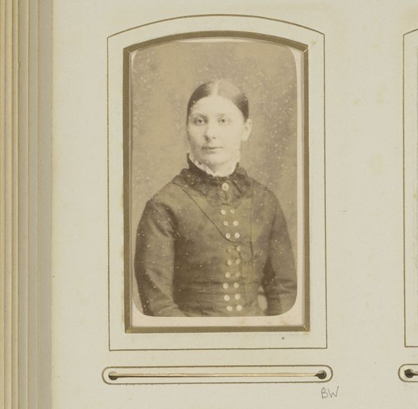 Editor: This is an albumen silver print titled *Portret van een vrouw met pijpenkrullen,* or *Portrait of a Woman with Curled Bangs*, made sometime between 1875 and 1899, by Photographie Française. The woman's gaze is quite direct, almost confrontational, and there is a formality to her dress. What do you make of this portrait? Curator: What strikes me is the sitter's agency in how she presents herself. While portraiture of this era was largely defined by bourgeois conventions, we can also see subtle assertions of self. Her direct gaze resists the passivity often expected of women in photographic portraiture during the late 19th century. Do you notice how the photograph, while adhering to a certain format, also offers space for individuality through details like her hairstyle and the confident set of her jaw? Editor: Yes, I see what you mean. I hadn't really considered the restrictive social context of the time. So, you’re saying even within those constraints, there’s still room for expression? Curator: Precisely. And it’s important to ask: Who was this woman? What choices did she make about how she wanted to be seen and remembered? Considering gender and class structures of the era, we can explore this image beyond a simple representation and discuss what it says about female identity. The very act of commissioning a portrait suggests a desire to participate in visual culture and perhaps even challenge prevailing norms. Editor: It’s amazing to think that this image can tell us so much more than what's immediately visible. It makes me realize how much I can learn from older portrait photography, understanding that they are not merely historical documents but complex visual statements. Curator: Exactly! By analyzing the power dynamics embedded within these images, we gain insight not only into the past but also into the enduring concerns of identity and representation. It shows us how photographs, even from long ago, can be part of larger discussions about our shared history.