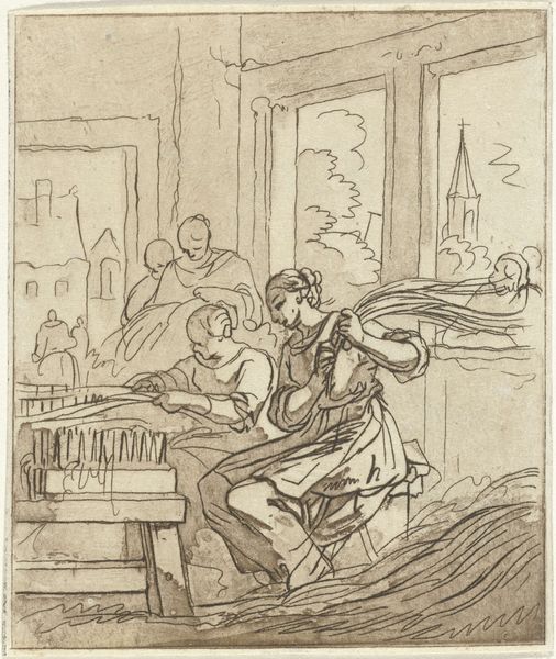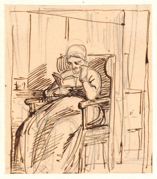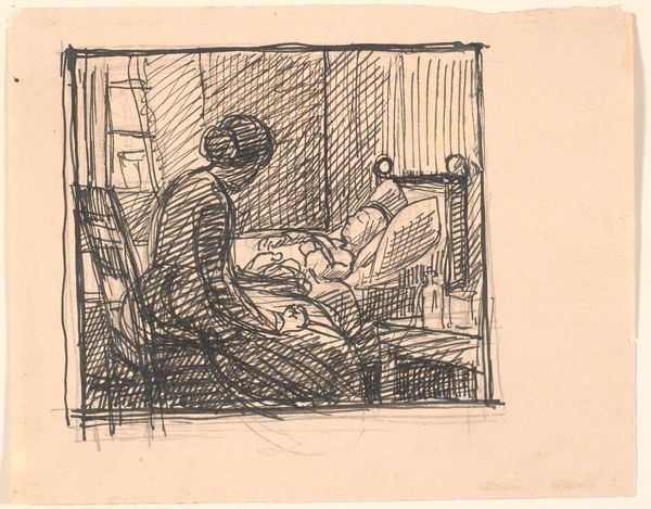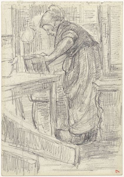 Curator: Before us we have Fritz Syberg’s “Her boede en gammel Kone med sin Kat og sin Høn,” a pen and ink drawing completed in 1928. The title translates to "Here lived an old woman with her cat and her hen." Editor: My first thought? Home. A very particular kind of home, though. Quaint, almost melancholic, and utterly lived-in. The scratchy lines make it feel immediate, like a fleeting memory. Curator: The cross-hatching used to build form and shadow, does lend a kind of…density…to the scene. You sense a heavy, layered atmosphere despite the lightness of the medium itself. Notice, the cat curled up, almost as part of the old woman's dress—a visual manifestation of symbiosis and familiarity. Editor: Exactly! The composition too—the hen perched precariously on the chair back, the spinning wheel taking up space. These create a rhythm of daily life, domestic labor intertwined with companionship. It speaks volumes. Is she spinning? Or perhaps mending something? Curator: Probably spinning; either way, it becomes a cyclical act. We can think about spinning, historically, in terms of weaving fate, female labour, storytelling. Fairytales always include a crone near the fireplace. And domestic animals feature prominently in allegories of virtues and vices as well. Editor: It's all archetypal imagery, then, whispering about folklore and the endurance of the ordinary. I keep coming back to that line quality, it really lends this rawness. Nothing is softened or romanticized, just a spare, unflinching depiction. The window and its pots is beautiful but it’s also harsh. The exterior light only offers relief from the dim space where shadows engulf most corners of the frame. Curator: We should think, too, of what those repeated symbols signify to our contemporary sensibilities. What meaning do we, modern observers, give the spinning wheel? Has it become quaint now, or does it resonate beyond our experience as a relic? What new associations do we attach to such icons? Editor: Definitely food for thought! It makes you realize how potent these seemingly simple images can be—holding onto so many threads of cultural memory, waiting to be tugged. Curator: Precisely, a reminder that even within a single room, entire worlds of history and meaning can reside.