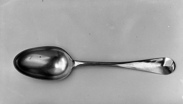 Curator: Immediately, I notice the reflections; it seems polished, almost beckoning us closer to this quiet ritual of teatime, don't you think? Editor: Absolutely. It's such a humble object, really, yet somehow dignified. This silver teaspoon was created between 1800 and 1830, crafted by Marcus Merriman and Company. It's part of the decorative arts collection here at the Metropolitan Museum of Art. Curator: Merriman, you say? I find it intriguing how something as simple as a spoon can hold so much symbolic weight. In that period, the act of sharing tea – with sugar, of course – had these subtle undercurrents of status and sociability. The teaspoon wasn't just a tool. It was almost an emblem of polite society. Editor: I imagine it resting in someone’s hand, feeling the cool weight of the silver. And that engraved monogram...each swirl and line hints at someone's story. A silver teaspoon tells a tale of intimate connections, cozy afternoons and private moments of luxury and belonging. Curator: Exactly! Those monograms functioned a lot like heraldry—they signal belonging and social identity in subtle ways, linking back to ideas of power and lineage. It transforms daily use into a form of ritualized enactment. Editor: It's odd, isn't it, to find profound ideas within mundane things. To consider how even a teaspoon contributes, in its quiet way, to the vast web of symbols and traditions which define society. Looking at it makes you question, doesn’t it, how much of what seems ordinary around us is secretly humming with encoded meanings? Curator: Indeed, it's about revealing the echoes within, a testament to the lasting impact of even the smallest details of our shared experience. Editor: This teaspoon certainly sparks so many quiet, reflective thoughts, doesn’t it?