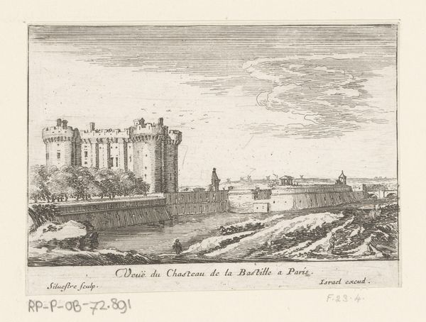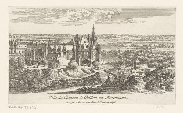 Editor: This is "Gezicht op het kasteel van Meudon," a cityscape etching and pen drawing made in 1654 by Israel Silvestre. The architectural detail is amazing! The mood is rather peaceful; I can almost hear the whispers of history coming from that grand castle. What do you see in it? Curator: It whispers to me too. This isn't just architecture; it's a performance of power frozen in ink. Silvestre, with his delicate lines, almost romantically portrays Meudon, perched above Paris. Do you see how the light dances across the stonework? It’s not just informative; it's *theatrical*. The scene feels staged, doesn't it? As though waiting for a courtly drama to unfold! I imagine the rustle of silks, the murmur of conversations. Does the château evoke similar sensations in you? Editor: Definitely theatrical! And the little figures – they seem so small in comparison to the landscape, like actors on a vast stage. I never thought of prints having that kind of performative aspect before. Curator: Think of prints then as PR before the age of selfies! These picturesque depictions helped shape opinions and perceptions of power. And Silvestre's genius was turning landscapes into almost fictional narratives. Notice also the tension between precise architectural rendering and more fanciful cloud formations... A little visual game being played! Editor: So much more than just a picture of a castle! I'll never look at Baroque landscapes the same way again. Curator: Good. Now when you look at those billowing clouds, imagine the sighs and scandals swirling in the Meudon courtyard below. Et voilà! Art comes alive.