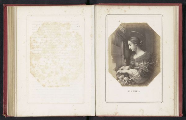Curator: Here we have a photograph, "Fotoreproductie van Das gute Buch," or "Photographic reproduction of the good book" made sometime between 1870 and 1890. The original resides here at the Rijksmuseum. Editor: Immediately, it evokes such a sentimental, almost wistful mood. There’s a Victorian air of quiet contemplation. Is she lost in the words, or the ghost of someone else's thoughts? Curator: That’s interesting. Gelatin silver prints such as these were rapidly gaining popularity around this time as photography became more accessible to the middle classes. Editor: Right, like a democratized portraiture? Before this, you'd have to commission an oil painting! But I love the hazy, almost dreamlike quality. It softens reality. Curator: The framing devices too—that arched, nested border around the oval—pushes us toward a Romantic vision. It’s certainly staged, a carefully constructed presentation of idealized womanhood, very typical of the era. A photograph attempting to be High Art. Editor: And failing? I'm not so sure. It reminds me that everyone is a performer to some degree, but that performative act can also tell a kind of truth. There’s vulnerability too in the delicate chiaroscuro effect across her face. A light just soft enough to evoke mystery. Curator: That soft focus hides as much as it reveals. So much is implied: her class, her piety, her social role… The photographic print becomes a societal record, capturing conventions as much as a person. Editor: I’d counter that she embodies universal emotions that reach beyond that, an introspective nature… Stillness... Don't we all crave a space where we are just allowed to think? Even if the props, the studio, everything about its creation, is constructed and of its time. Curator: It's true; that desire transcends time. A potent reminder to look beyond the historical and recognize the human connections—in photography, as well as history itself. Editor: Absolutely, I suppose that's why some stories bear rereading, as well as retelling. And what a photograph this has been for that.