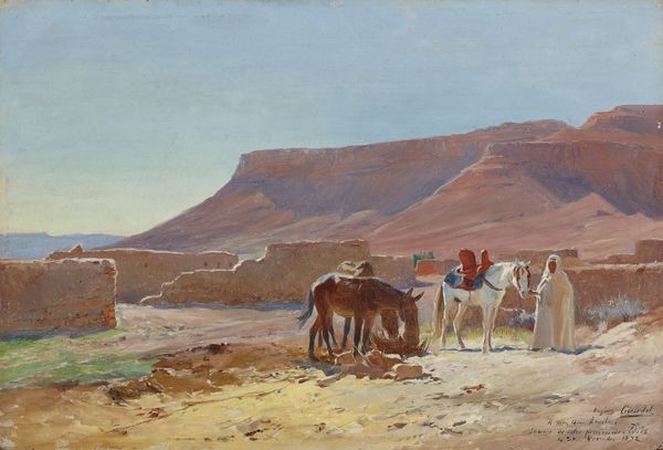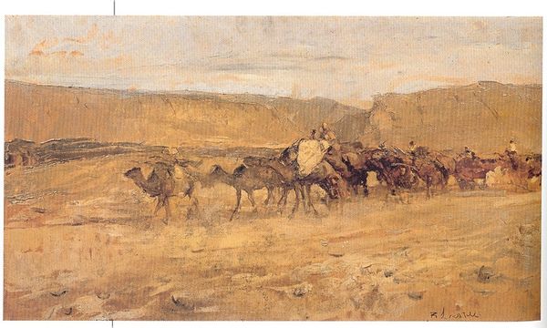 Editor: So here we have “Une Caravane Dans Le Désert,” an oil painting attributed to Eugène Girardet. I get this immediate feeling of stillness, despite all the movement implied by the figures and animals. Everything feels sun-drenched and a little hazy. What captures your attention most in this piece? Curator: Hazy is a great word for it! It’s a painting about a journey, but maybe also about longing? For what, exactly, I couldn't say for sure. What strikes me is the way the light kind of softens everything. You see the academic art and realism style playing, right? There is the perfect representation in terms of rendering details from the cloth of the characters as the fur on the animals... it grounds the scene, even if you are in an ethereal world! Editor: Yes, now that you point that out it does bring me back to Earth. But does the location add anything to this particular genre scene? Does the desert symbolize anything here? Curator: That's the fun part! The desert is, literally, just the location of the journey for me. There is some poetry, I can recognize, but the place is not the element that strikes me. It gives a beautiful scene for the academic work I mentioned before. And this horizon fading away just boosts the romantic landscape feeling and the characters and camels walking and going to nowhere. What do you think of the figures in the painting? Editor: They seem so…anonymous. Part of the landscape themselves. Maybe that adds to the feeling of stillness, despite the implied motion. Thanks! It makes the work speak to me more personally! Curator: Indeed! The piece leaves you something personal, that feeling of your very own desert to discover and where only you can define your way! Thank you!