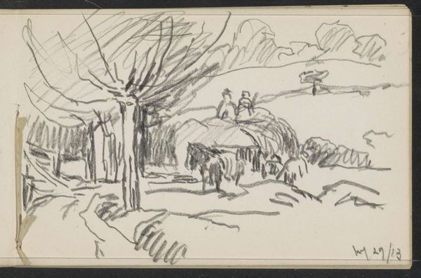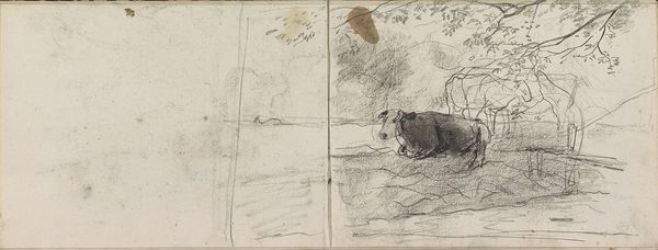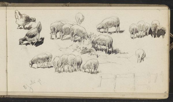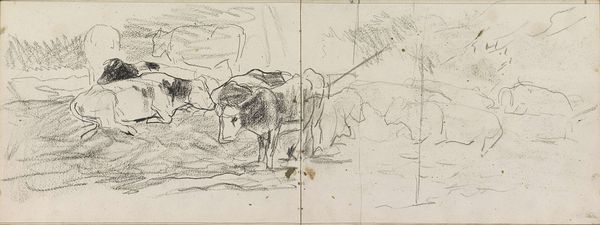 Editor: Here we have Anton Mauve's "Cows in a Meadow near a Fence," a graphite and pen sketch from the late 19th century. It strikes me as a very intimate portrayal, like a quick glimpse into the Dutch countryside. What can you tell us about it? Curator: It's a fascinating peek into Mauve's process. Consider the socio-political context of the time: agrarian life was rapidly changing due to industrialization. Artists like Mauve, working within the Hague School and Impressionist movements, were very interested in capturing the perceived authenticity of rural life, although there is often a tension between reality and idealized imagery in such works. What impact did this social framework have on Mauve? Editor: So, by capturing this scene, was Mauve perhaps making a subtle commentary on a changing world, or reinforcing a specific narrative about the Dutch landscape? Curator: Precisely! Think about who his audience was. Wealthy city dwellers were the primary consumers of art. These images of tranquil rural life provided a sense of nostalgia, a comforting illusion. Mauve likely relied on the urban art market. Did he see any tension in depicting the rural lives that his patrons often overlooked? Editor: It's easy to get caught up in the picturesque scene and miss that. I didn't even think about the intended audience and its effect on subject matter. Curator: Indeed. It is a sketch; it’s not about technical skill, but rather capturing a moment and speaking to a cultural sentiment that valued simplicity even as life grew more complicated. Consider, even in its unfinished form, it resonates with a longing for the past. Editor: This gives me a completely different appreciation for what I originally took to be a simple landscape drawing! Thank you. Curator: It was my pleasure, a constant engagement with both society and history allows one to further enhance the art!