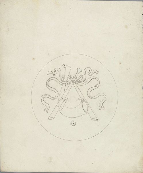Curator: Let’s discuss “Violon et autres instruments negres”, a pencil drawing by Pierre Félix van Doren, dating to before 1828. Editor: It strikes me as rather austere for such a potentially vibrant subject. The precision of the line work creates a sense of detached observation. Curator: Note how the circular frame, echoing classical medallions, encloses a meticulously rendered collection of instruments. The formal structure is quite deliberate. Consider the placement of each item – the violin vertically bisecting the space, anchored by ribbons and balanced with what appears to be a tambourine and crossed sticks. Editor: Yes, and what’s particularly compelling is the choice of “negres” in the title. We can unpack layers of historical meaning connected to minstrelsy and performance tied to these instruments in the 19th century. There’s a palpable tension. The ribbons almost mock the gravity suggested by other elements. Curator: Indeed. There’s a calculated restraint in the line quality itself. Observe how the shading is minimal, directing our attention instead to shape and outline. It almost denies any emotional excess typically associated with musical performances. The structure resists any overflow, and the symbolism could be multiple and conflicted. Editor: Exactly, especially considering Van Doren was working in this era of burgeoning colonial expansion and anthropological inquiry. It forces us to question whose vision and intention we're really viewing. This piece challenges assumptions about visual narratives related to Black people in the diaspora by being so...stark. Curator: A challenge precisely built into its structure, into this calculated formality, no less potent for its graphic simplicity. Van Doren gives us not a celebration but a formal investigation of instruments inextricably linked to cultural stereotypes and memories, without judging them explicitly. Editor: Leaving viewers much to consider concerning not just representation but its inherent politics and echoes within our cultural archive. Curator: It is in that very unresolved state, I feel, that its modern significance is to be found.