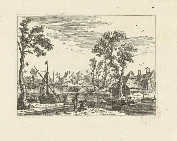 Jan van Goyen’s drawing, "Wayside Inn", invites us into a bustling scene rendered in delicate graphite. The composition, dominated by horizontal lines that suggest a sprawling landscape, is anchored by the inn. This architectural form serves as a nucleus around which figures cluster and disperse. Van Goyen masterfully employs line to create depth and texture. Notice how the density of lines increases in the foreground, defining the road and figures with clarity, then gradually thins as the eye moves towards the background. This contrast enhances our sense of space, subtly destabilizing the distinction between near and far. The overall effect is one of dynamic equilibrium, a controlled chaos where the inn becomes a transient hub. Van Goyen uses the drawing’s formal elements to suggest broader themes of transience and communal gathering, inviting us to contemplate the inn’s function as a meeting point between the local and the foreign. The artwork beautifully captures a moment in time, fixed yet fleeting.