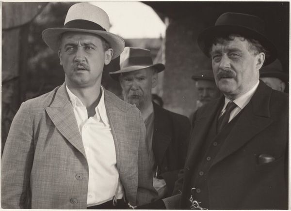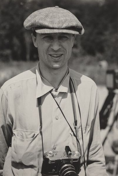 Editor: This is a photographic portrait by Dorothea Lange, entitled "Maynard Dixon," taken around 1930. The sepia tone and close-up composition give it a very direct and personal feeling. What do you make of this portrait? Curator: Notice how Lange uses light and shadow to sculpt Dixon's face, particularly highlighting the planes of his cheekbones and the strong line of his jaw. This use of chiaroscuro creates depth and enhances the overall sense of ruggedness. How do the hat and shirt function in this photograph? Editor: I think the hat casts this large shadow on the right, providing asymmetry, and maybe creating a somber mood. And his utilitarian shirt creates the feeling that he’s a hardworking individual. Curator: Precisely. Lange seems primarily interested in capturing Dixon’s essence through purely visual means. The photograph functions as an essay of shape and form, utilizing varying textures and subtle gradations of tone to achieve the emotional tenor that you mentioned. Consider the way the stark background throws into sharp relief the contours of his face and hat. The visual relationship makes his figure legible, distinct, but also seems to want to tell us something specific about Maynard Dixon, or the artist that Lange wanted to show. Editor: So it's less about the person and more about how all the formal elements come together? Curator: Absolutely. We decode the cultural values associated with the person via purely visual encoding. The effect emphasizes a sense of raw honesty that other techniques could obscure. Editor: That's a really interesting way to look at it. I never would have considered that before. Curator: And, thinking about that now, it changes my appreciation, as well. Focusing on the details adds a lot to it.
