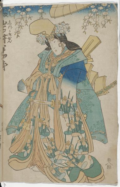 Editor: Here we have "Scene with Kinshojo from the Kabuki Play - Kakusenya Kassen-," a mixed-media print by Utagawa Kunisada, possibly created between 1850 and 1855. There's a sense of theatrical drama, maybe even tension in the stillness of the central figure juxtaposed against the stylized waterfall. How do you interpret this work? Curator: The print operates within a vibrant intersection of art, theatre, and social commentary. Kabuki was a popular form of entertainment, but it also functioned as a space to critique and negotiate power structures, especially regarding gender roles and social hierarchies. Notice Kinshojo's attire. How does it perform ideas of class or status? Editor: Well, it looks pretty opulent! All the layering, the colors... It speaks to a position of privilege, right? Curator: Precisely. But also, consider the male actors who often played female roles in Kabuki. This print, and the Kabuki play itself, becomes a space to explore the performativity of gender and the subversion of social norms. The waterfall, juxtaposed with the figure, evokes themes of ephemerality and the constant flux of life. In what way do you feel that image speaks to themes of identity or social justice? Editor: I never considered the interplay between identity and setting here; that juxtaposition definitely gives me a different view. Curator: Exactly. Kunisada wasn't merely depicting a scene but inviting the viewer to question the constructed nature of identity within a specific historical context. Editor: That’s fascinating! Thanks to your analysis, I can appreciate how the work operates on so many different levels and challenges my initial perception. Curator: And for me, this discussion reinforces the idea that art from the past always has something relevant to tell us about our present concerns.