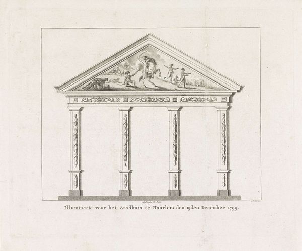 Editor: This is "Voetstuk met helmen en schild," or "Pedestal with helmets and shield," a print made between 1772 and 1779 by Jean Pelletier, here on display at the Rijksmuseum. It seems like an architectural plan, very formal and austere. What do you see in this piece? Curator: This print, embodying Neoclassical aesthetics, presents an idealized vision of power, steeped in the visual language of ancient empires. What is communicated by showcasing the elements of war, like helmets and shields, on a pedestal? Editor: It suggests military strength as something to be admired and elevated, I guess? Curator: Precisely! Consider how this imagery reinforces hierarchies. Who would be positioned on such a pedestal in reality, and conversely, who might be excluded from this vision of glory? The artist assumes a cultural and historical context dominated by the elite. How might marginalized communities interpret this piece? Editor: I never thought about it that way, as excluding certain groups. I was only focused on the helmets. I guess you are suggesting that these symbols have a historical impact beyond their immediate meaning? Curator: Yes, and it's also worth investigating how this art relates to broader power structures. We might think about it in terms of contemporary dialogues around monument removal, asking ourselves, whom do we choose to honor and why? Editor: That is so helpful. I learned a lot about the relationship between power, social context, and art. Thanks! Curator: Absolutely! These objects provide unique perspectives on intersectional dialogues of identity and power.