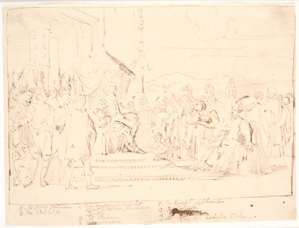 Editor: This is James McBey's "Grain Market, Tetouan" from 1913, created with pen and ink. It feels almost like a snapshot, a quickly captured scene of everyday life. What stands out to you? Curator: What interests me is McBey’s engagement with Orientalism not through grand canvases but through this rapid, seemingly casual, drawing. It highlights the colonial gaze's interest in labor and trade. What can a pen and ink sketch tell us about the social realities of the grain market, about the movement of goods, bodies, and perhaps, capital? Editor: That's a really interesting way to look at it. I hadn't considered the choice of materials as part of the statement. Does the sketch medium downplay the subject in some way? Curator: Exactly. Is McBey emphasizing the immediacy of his experience, positioning himself as a detached observer merely documenting an exotic scene for Western consumption? Consider also how the accessibility of pen and ink aligns with sketchbook practices. Does this framing normalize a casual consumption of Moroccan labor? What kind of value is attached to that labor then and now? Editor: I see your point. It almost makes it feel like a commodity itself, reduced to a quick sketch. Curator: Precisely. By looking at the production—the sketch itself—we can reveal how art can participate in constructing, and perhaps, reinforcing, power dynamics. It asks us to consider the material reality of artmaking within a complex network of global exchange. Editor: I’ve definitely learned a lot from considering the materials and their implications. Thanks for helping me unpack all of this. Curator: My pleasure. Looking at the means of production is a rewarding and critical way of understanding a work of art and its place in society.