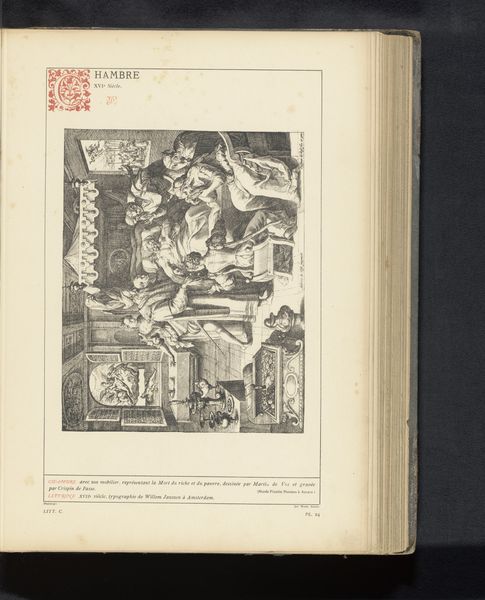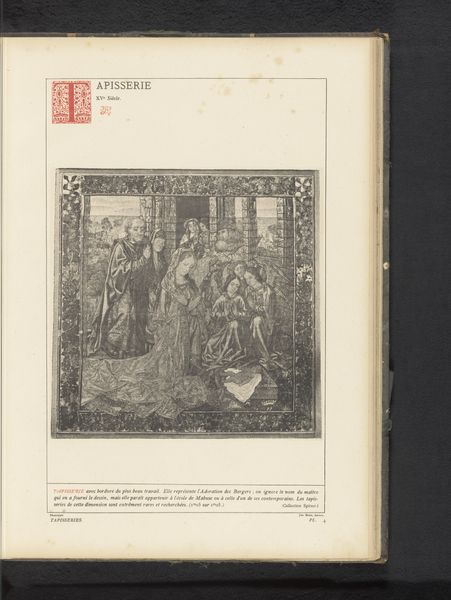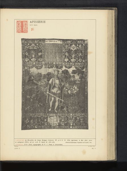 Editor: Here we have an image of a tapestry, before 1887, with the lengthy title "Wandkleed met verschillende scènes en arabesken," which translates to "Tapestry with various scenes and arabesques." It’s hard to tell exactly from this image, but it seems like the original work was rendered in textile. The monochrome aesthetic evokes a sense of age. What stands out to you? Curator: Initially, I'm drawn to the structural composition itself. The central scene, seemingly depicting a hunt, is framed by an elaborate border filled with repeating patterns and figures. Notice how the engraver uses hatching and cross-hatching to create tonal variations, mimicking the depth and texture of the original textile. Editor: I see what you mean. The contrast between the densely packed border and the slightly more open central scene creates a visual hierarchy. What about the "arabesques" mentioned in the title? Curator: Those are evident in the intricate, flowing patterns that populate the border. They add a layer of visual complexity, guiding the eye around the composition. It's a study in contrasting textures and forms; consider how the static nature of the print medium transforms a presumably colorful and pliable woven textile into a graphic composition emphasizing line and form. It creates a new, distinct aesthetic experience from its source. Editor: That’s a good point. It really forces you to focus on the lines and shapes, devoid of any color distractions. I initially viewed it as a straightforward reproduction, but I appreciate the value of its lines as a work on paper now. Curator: Precisely. Through rigorous adherence to the medium’s constraints, a print attains aesthetic autonomy distinct from the original model. It also demands the viewer engage more intimately with compositional arrangements rather than focusing solely on subject representation. It emphasizes the work's unique artistic qualities rather than its potential narrative. Editor: It is fascinating how focusing on composition brings out another layer of this tapestry!