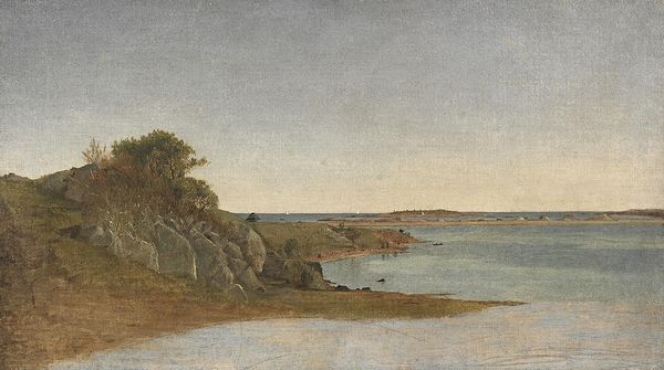 Editor: Looking at “Almys Pond Newport,” an oil painting, it has this strikingly tranquil atmosphere. There's such clarity and a calm luminosity about the scene; three cows in the tall grass seem at peace in nature. I’m curious about its cultural relevance, what can you tell me about the work? Curator: Well, considering the context of its time, likely mid-19th century and associated with the Hudson River School, this painting presents an interesting study in the development of American landscape painting. While seemingly straightforward in its depiction, how do you think Kensett's portrayal of nature speaks to the broader cultural narratives? Editor: Hmmm. Is it just as simple as this celebrates nature? Or is it an idealistic vision? Curator: Indeed, that is the main reading. These landscapes offered a visual articulation of the concept of Manifest Destiny. They visualized the idea of humans within an abundant and divine providence in the mid-19th Century. They encouraged people to spread west. They were powerful instruments of ideological reinforcement. The calm light of Kensett can thus be said to work on this dimension, creating confidence. Do you notice any subtle visual cues that may emphasize such sentiment? Editor: It might be the muted colors that contribute to its subtle messaging? They instill this serenity and calm rather than a feeling of some monumental and raw beauty? Curator: Precisely, which points to a sophisticated public messaging at play. I learned to observe that landscapes should not be simply viewed, they are also cultural products. Editor: I now realize landscapes may carry deeper meanings! Thanks for shedding light on the painting’s cultural and historical significance.