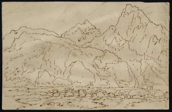 Editor: This small, undated sketch from the British School, titled "Landscape and Nose and Lower Head of Dog or Sheep," features a somber landscape with mountains and a prominent cross. It feels almost like a stage set for a tragedy. What do you see in this piece? Curator: The sketch provides a window into the artistic practices of its time, where the sublime in nature was increasingly tied to national identity. Notice the cross; how does it function not just as a religious symbol, but perhaps as a marker of territory, or of a historical narrative being constructed? Editor: That’s interesting, I hadn’t thought about it like that. It seems to be a way to define place. Curator: Exactly. And consider how the 'British School' designation itself serves to categorize and promote a certain kind of artistic production within a specific cultural framework. Editor: So much to think about! This really challenges my initial impression. Curator: Indeed, art is rarely just what it seems; it's always embedded in layers of cultural and political meaning.