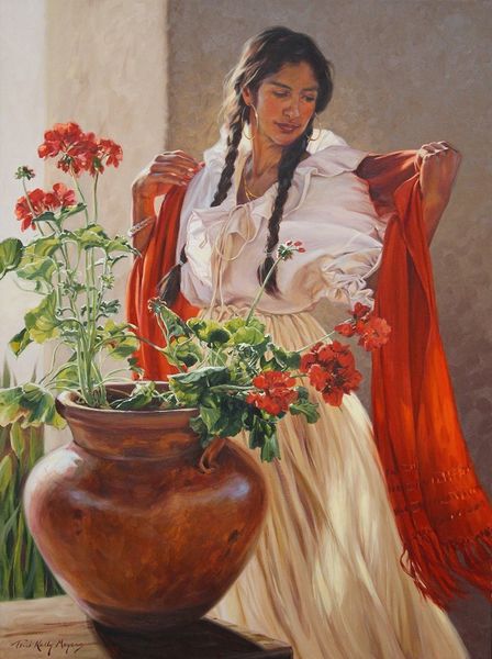 Curator: Terri Kelly Moyers invites us into a moment of quiet reverie with her 2016 oil painting, "Afternoon At San Gabriel." What's your first take on it? Editor: A certain golden melancholy. It’s this stillness, combined with the muted tones, that gives the painting its contemplative mood, wouldn't you agree? Curator: Absolutely, and I think Moyers captures the light so poetically! See how it dances on the brickwork, the gentle fall of shadows that shapes our subject and setting with almost Renaissance grace. She's really leaning into that plein-air tradition here. Editor: You're right, the handling of light and shadow is masterful! It's particularly noticeable around the draped shawl. We can observe a certain balance in its composition; the solid architectural details offer grounding to the fluid fabrics of the shawl and skirt. Curator: You've zoomed in right away! That shawl is indeed spectacular. All of those lovely flowers woven in, the cascading fringe! They speak to me of travels, of cherished family heirlooms, something from a treasured box that tells a life story in textiles. Editor: The contrast in textures is really key here; the rough brick versus the delicate weave, and from a philosophical perspective, consider how the artist manipulates the medium. How, in its application, the paint simulates these qualities. Curator: It is such a human moment isn't it, frozen for us to unpack and contemplate! She's right there, maybe caught in her own daydreams or noticing, as we do, the light through the vines. Editor: Yes, the way the composition draws the eye, you see how she is situated slightly off-center with the trailing foliage echoing her own pensive inclination of her head. Curator: Thanks for teasing out how deliberately the artist composed all of this! And thank you, Terri Kelly Moyers, for a lovely encounter in "Afternoon at San Gabriel," a painting that lingers with me. Editor: A moment indeed suspended and meticulously considered for us. A valuable illustration of light, materiality, and reflective artistry.