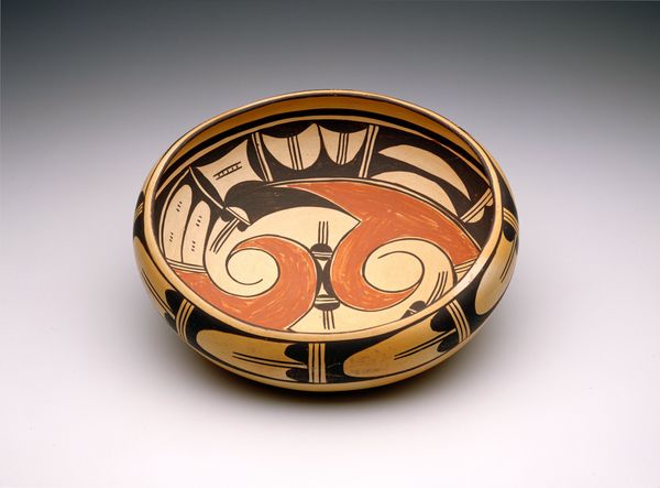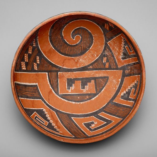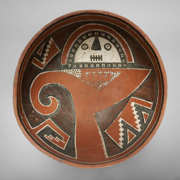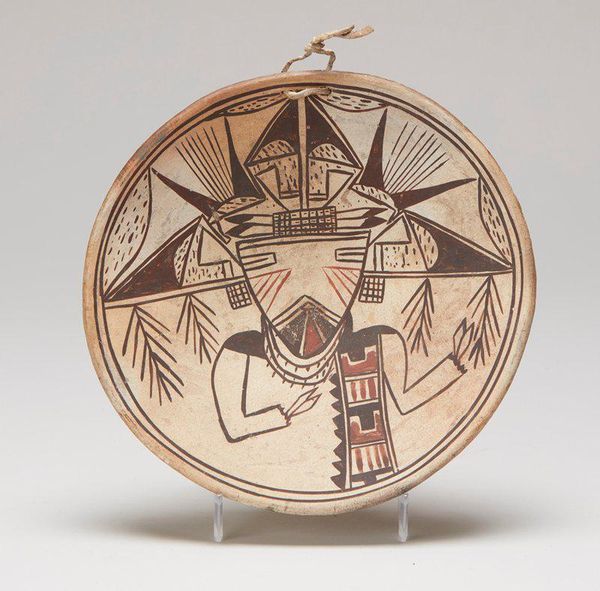 Editor: Here we have a plate, ceramic and porcelain, hailing from a Royal Berlin China Service around the 20th century. The piece seems to blend ancient and decorative art styles, with a fascinating, somewhat fantastical central figure and intriguing decorative elements along the rim. What catches your eye about it? How do you interpret this piece in terms of form and structure? Curator: Its success lies primarily in its decorative power. The interplay of the black silhouette against the reddish-orange ground creates a striking visual dichotomy. Notice how the concentric circles—the rim, the band of ornamentation, and the central medallion—organize the composition. Are you struck by the strategic placement of those seemingly arbitrary, perhaps asemic, marks? Editor: I am! The lines and shapes certainly contribute to the overall pattern and fill the space quite effectively. Does the central figure strike you as referencing a specific mythological figure? Curator: The central figure, though suggestive, matters less than the overall design. Note how the artist manipulated the symmetry of the figure and juxtaposed it with the surrounding, somewhat chaotic, arrangement of motifs. This tension generates a visual energy. It adheres superficially to Ancient conventions without fully committing to any particular historical program. Editor: That's a clever observation. So, you're suggesting the real point here is the artistic handling of shape, color, and pattern? Curator: Precisely. The essence of this plate is not in its narrative content but in its formal relationships and decorative effect. Editor: I see it now; focusing on the elements like the repetition and placement of the abstract marks truly reframes how I appreciate this piece. It is so much more than just a plate! Curator: Agreed. The semiotic interplay enhances the experience and suggests so many questions around symbolic artistic expression.