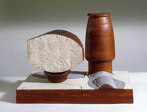 Curator: Here we have Barry Flanagan’s intriguing sculpture, “a nose in repose,” a piece residing in the Tate Collections. The dimensions are roughly 89 x 75 x 30 centimeters. It's certainly a conversation starter. Editor: It certainly is! My first impression is one of playful monumentality. The rough stone atop those stacked wooden blocks creates a fascinating tension. Curator: I find the juxtaposition of materials quite striking. Flanagan, born in 1941, challenges our assumptions about sculpture by combining found natural stone with seemingly mass-produced wooden elements. It blurs the line between nature and industry, doesn’t it? Editor: Precisely! The spiral carving on the stone draws my eye—a formal element referencing classical sculpture perhaps, yet rendered in such a raw, almost primal way. The wood blocks are almost like a minimalist plinth, an unexpected base for this nose in repose. Curator: And consider the labor involved. The quarrying and shaping of the stone, the milling and assembly of the wood, all contribute to its meaning as an object of production. Editor: A fascinating exploration of form and material, wouldn't you say? Curator: Yes, indeed, a very intriguing work.