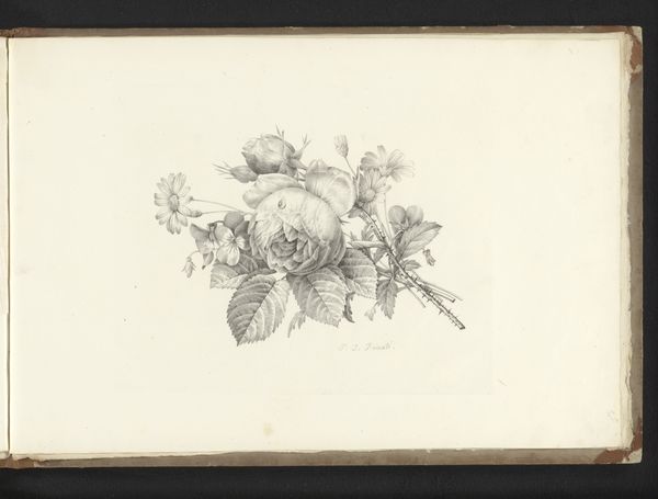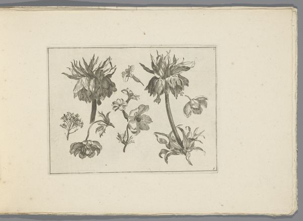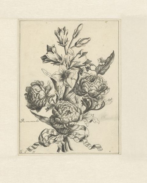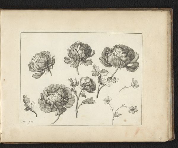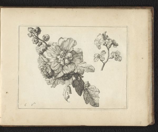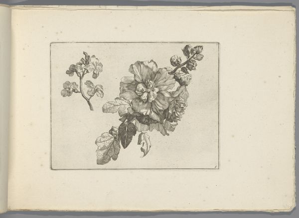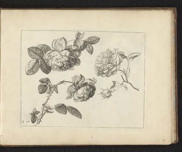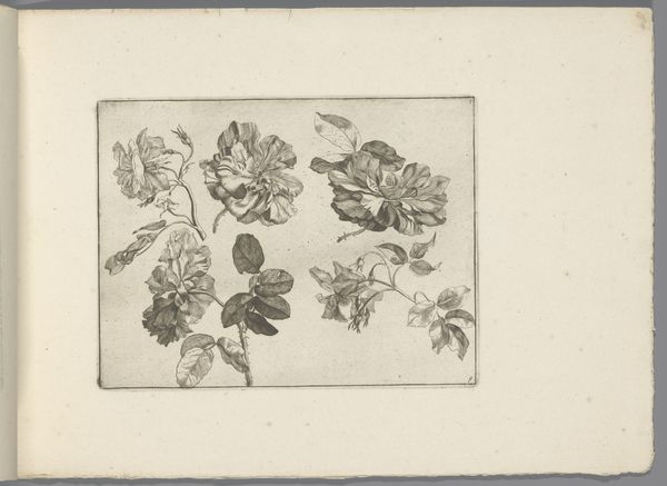 Editor: This is "Rozen" by Gerard Valck, made sometime between 1670 and 1726. It's an engraving, printed in ink on paper. I find the image delicate, like pressed flowers in an old book. What story can you tell me about it? Curator: It's interesting you use the term 'delicate.' While seemingly straightforward, consider how prints like this circulated in the 17th and 18th centuries. These botanical studies, meticulously rendered through engraving, played a role in the burgeoning scientific culture. Editor: Scientific? So it's less about the beauty of roses, and more about... classifying them? Curator: Not entirely! But consider the socio-political context. Exploration and colonialism were driving intense interest in the natural world. Gardens were status symbols and sites for scientific inquiry. These prints, often collected in albums, functioned both as aesthetic objects and tools for knowledge. They speak to the power structures of the time. Who had access to this knowledge, and what did they do with it? Editor: So the image becomes part of a system... I hadn’t thought of it that way. It changes how I see the artistry too, it's about communicating information efficiently and accurately. Curator: Precisely! Even something as seemingly innocuous as a rose becomes entangled with history when we consider its context. Does this give you a different appreciation for its creation? Editor: Definitely. It makes me wonder how scientific illustration is seen today, and who controls that knowledge now. It's given me a lot to think about!