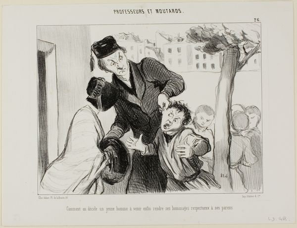 This lithograph, “Which proves again that already since high school man supports himself on the shoulders of his kin in order to advance in life,” was made by Honoré Daumier in the mid-19th century. Daumier was a master of lithography, a printmaking technique that uses a stone or metal plate with a smooth surface. The artist draws on the surface with a greasy crayon, then applies ink, which sticks only to the drawn areas. The printmaker then transfers the image to paper. Here, the velvety blacks and the crisp lines are evidence of Daumier's command of the medium. But lithography also has a social significance. It was a relatively inexpensive way to produce images, making art more accessible to a wider audience, and well-suited for satire. Daumier used this printmaking technique to comment on social and political issues in France. The composition is a clear metaphor for social climbing, achieved through the exploitation of labor. By considering Daumier’s process, and the context of his work, we can better understand its enduring relevance and the importance of printmaking for the distribution of ideas.