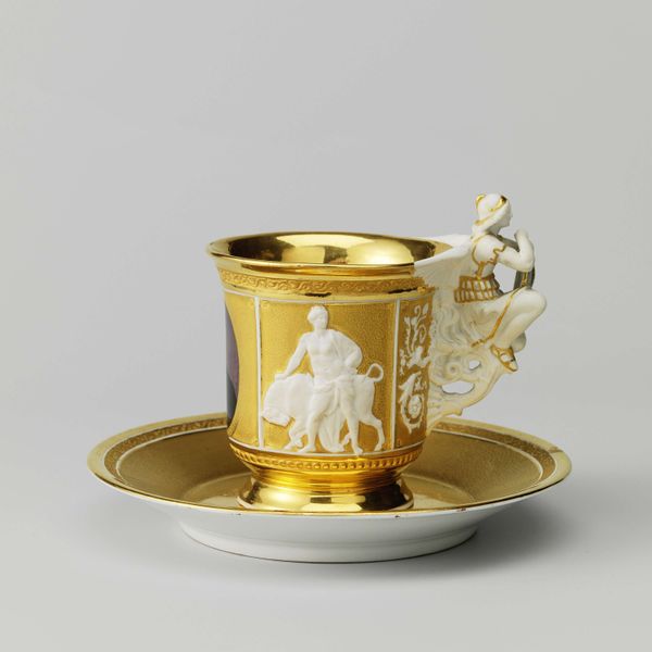 Curator: The “Kop beschilderd in sepia,” or “Cup painted in Sepia,” crafted in 1879 by Eduard Alexander Hilverdink, presents a captivating instance of genre-painting realized through the refined artistry of painting. Editor: There is something quite striking about this object; the warm sepia tones create a wistful, almost dreamlike ambiance across this piece. It is unusual to encounter this on porcelain. Curator: It certainly invites discussion on medium and artistry. What are your initial thoughts on the confluence of art, material and the socioeconomic implications of art's chosen form here? Hilverdink here renders this small scene, seemingly pulled directly from Dutch rural life. We might question his motivations and his consumer market here? Editor: Right! Genre painting became increasingly popular amongst the Dutch middle class seeking to assert and solidify their values. What strikes me is how the very act of transferring this onto a common item—a tea cup—potentially alters its function. Curator: Indeed, everyday utilitarian items served as vehicles for these small intimate and picturesque representations, transforming common, available and accessible objects. We could consider this art democratization of a sort, made purchasable, owned, handled and employed in daily practice? This contrasts sharply with works displayed in formal galleries or homes of the aristocratic patrons. Editor: Interesting! We can note too, this painting on porcelain might have circulated among women. Consumption of goods like tea was an intimate performance, tied closely to the burgeoning middle-class Dutch Republic— and painting could easily be tied into expressions of status. The political implications behind seemingly apolitical artworks must be accounted for too, I believe. Curator: Agreed. Through the sepia technique, the artist offers us a scene that both captures the essence of its time and prompts consideration regarding material culture. It’s a dialogue between fine art traditions and practical utility. Editor: Yes, precisely. A window onto Hilverdink’s world, yet held within the curve of a delicate cup and saucer. What a compelling thought.