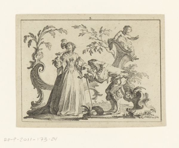 Johann Esaias Nilson created this print of a man smoking and drinking atop rococo ornaments sometime in the 18th century. Nilson was working in Augsburg, Germany, during a time of great social and political change. Rococo art was in vogue at the time, characterized by its ornate detail. This print is typical of the period, with its fanciful curves and playful imagery. It can be interpreted in many ways. The man smoking and drinking might be seen as a symbol of leisure and luxury, while the woman standing next to him perhaps represents a more industrious and virtuous lifestyle. The image also reflects the growing middle class in Europe, with its emphasis on domesticity and personal pleasure. Nilson's work provides a window into the values and concerns of his time, but to truly understand it we would need to consult a wide range of historical sources: prints, treatises, and social histories, so that we can contextualize this scene within the broader scope of 18th-century European culture.