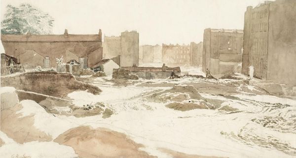 Curator: William Taverner, active in the early 18th century, created this watercolor titled "Buildings with Ruins in the Foreground." It’s currently held in the Tate Collections. Editor: Wow, it's a scene of decay, isn't it? All these washed-out tones give it a somber feel, like a memory fading away. Curator: Indeed, Taverner was part of a wave of artists captivated by ancient Roman ruins. This interest reflects a broader cultural fascination with classical antiquity and its remnants. Editor: It’s amazing how he finds beauty in the broken. I mean, look at that ladder leaning against the crumbling wall—such a simple, human touch amid the grandeur of ruins. There is something deeply optimistic here. Curator: Perhaps optimism is the key. Ruins provided tangible links to the past. They served as powerful reminders of the cyclical nature of civilization and empire. Editor: I like that. So, it’s not just about what’s lost, but also about what endures, what we can learn from what's left behind. Curator: Precisely. Taverner's work is a reminder of the constant negotiation between past and present. Editor: It makes you think, doesn't it? What will remain of us?