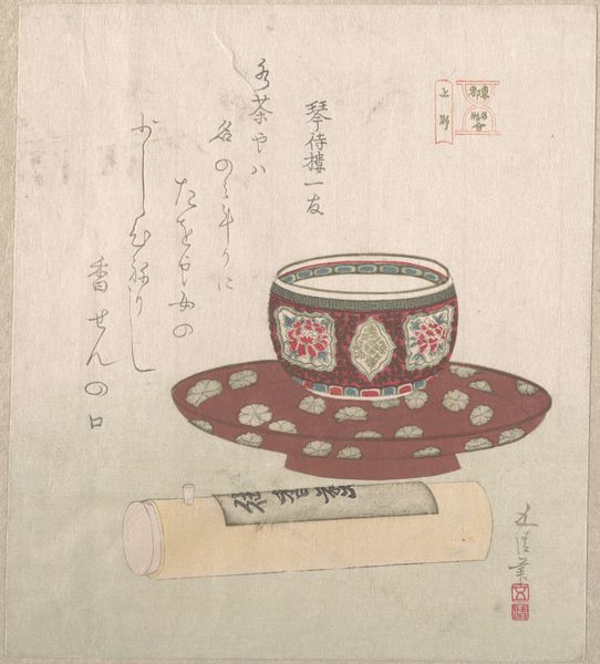 Curator: Right now, we’re looking at "Teacup and Tea Heater," a color woodblock print attributed to Ryūgetsusai Shinkō. It probably dates from somewhere in the 18th or 19th century, a lovely example of ukiyo-e currently housed here at the Met. The palette seems deliberately muted, perhaps a technique to direct the viewers focus. What stands out to you, visually? Editor: Well, there’s a definite calmness. I’m immediately drawn to that covered teacup – the little landscape painted on it looks like a memory glimpsed through frosted glass, and also, the stark geometry of the set-up seems to whisper of ritual, the precision of preparing tea. Curator: Exactly! It's interesting how Shinkō captures a moment of quiet domesticity with such stylized elegance. Even the patterned box below, likely for sweets, echoes that structured harmony, reminiscent of formal tea ceremonies that held societal significance. It really underscores how mundane activities can hold profound meaning. Editor: That's right, because those seemingly simple designs have layers. Take those fan shapes on the box: they symbolize authority, wisdom, even divine power – it's more than just ornamentation. And doesn’t tea itself serve as a symbol of tranquility, refinement, spiritual connection? Curator: Precisely. Tea culture had become intrinsically interwoven with both the social rituals and philosophical ideals of the time. I notice that despite its functionality as tableware, the teacup is more like an icon, and that it suggests contemplation and respect through design. Editor: You are right. The calligraphy that appears in this print also adds another layer; while its specific translation might elude me, its presence elevates the visual and, I feel, reminds me that this quiet still life holds a literary or poetic heart as well. Curator: Agreed, the calligraphic text underscores the artwork's deeper significance, hinting at its intended intellectual appreciation for those who knew it and prompting me to further research. Its simple composition speaks volumes about the interconnectedness of life and meaning within ukiyo-e. Editor: Definitely. And it is this quality to represent inner life and meaning so powerfully is what made these objects culturally significant throughout time, and continues to connect me as a modern-day viewer.